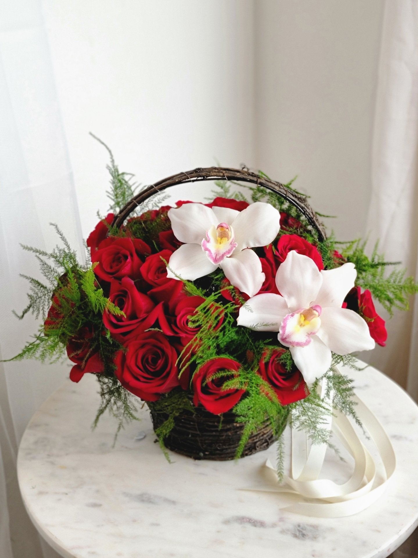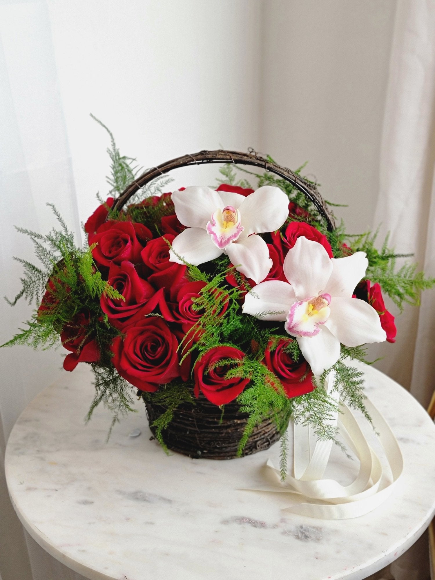 Red roses are considered a classic version of a bouquet that can be given for absolutely different occasions. But more often it is a bouquet of red roses that is used as a present for their loved ones. Red has always been considered a symbol of love, passion, sincerity. We can assemble a basket of red roses of any size at your request