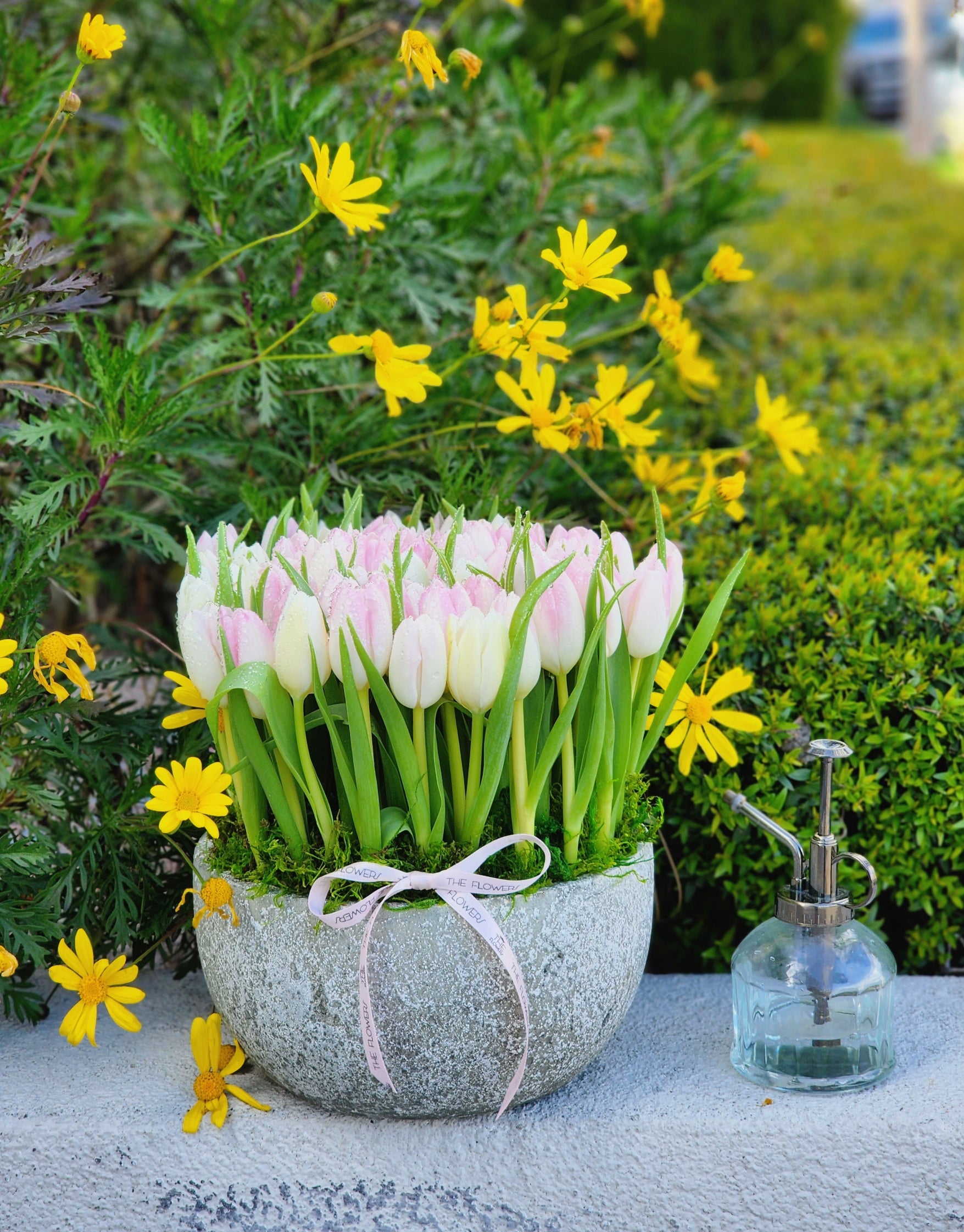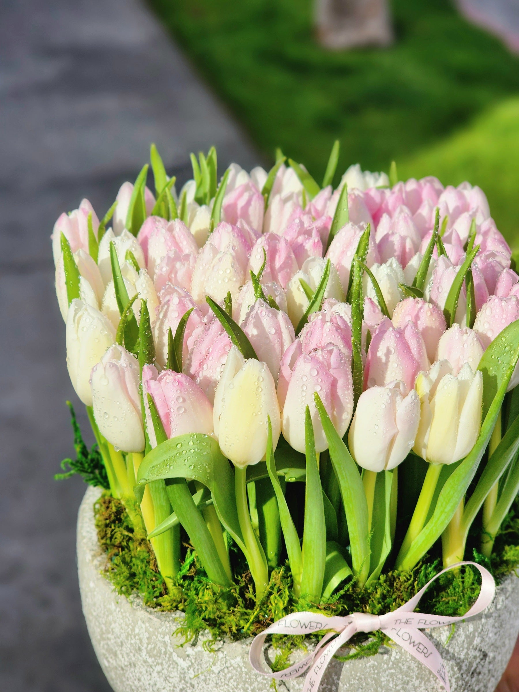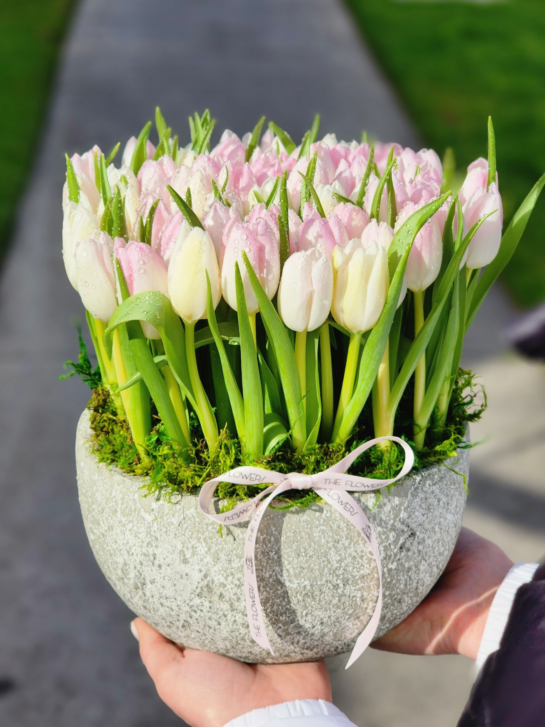 70 soft pink tulips in a cement vase looks luxurious and festive. We assure you that everyone will be delighted with such a gift!