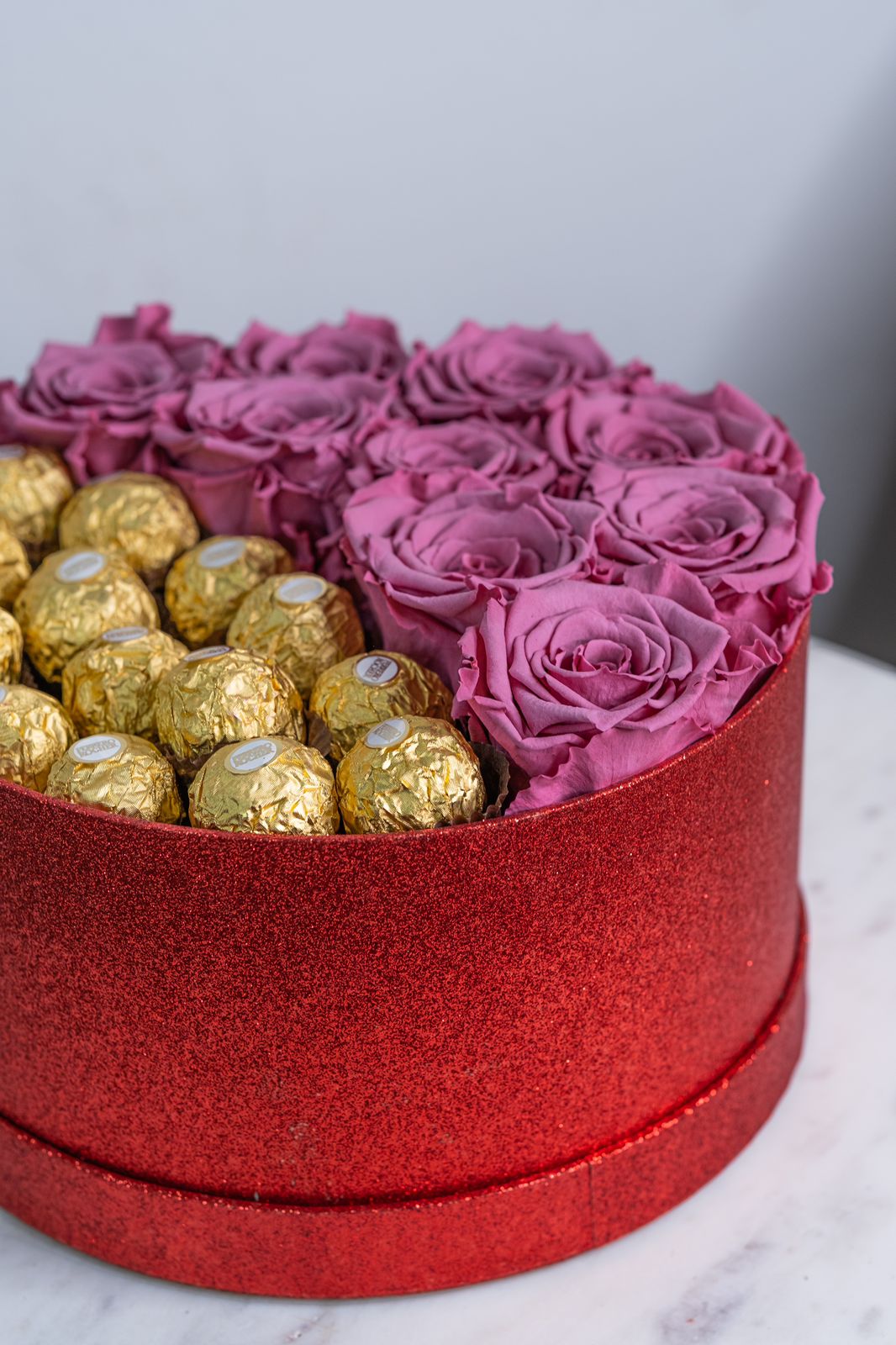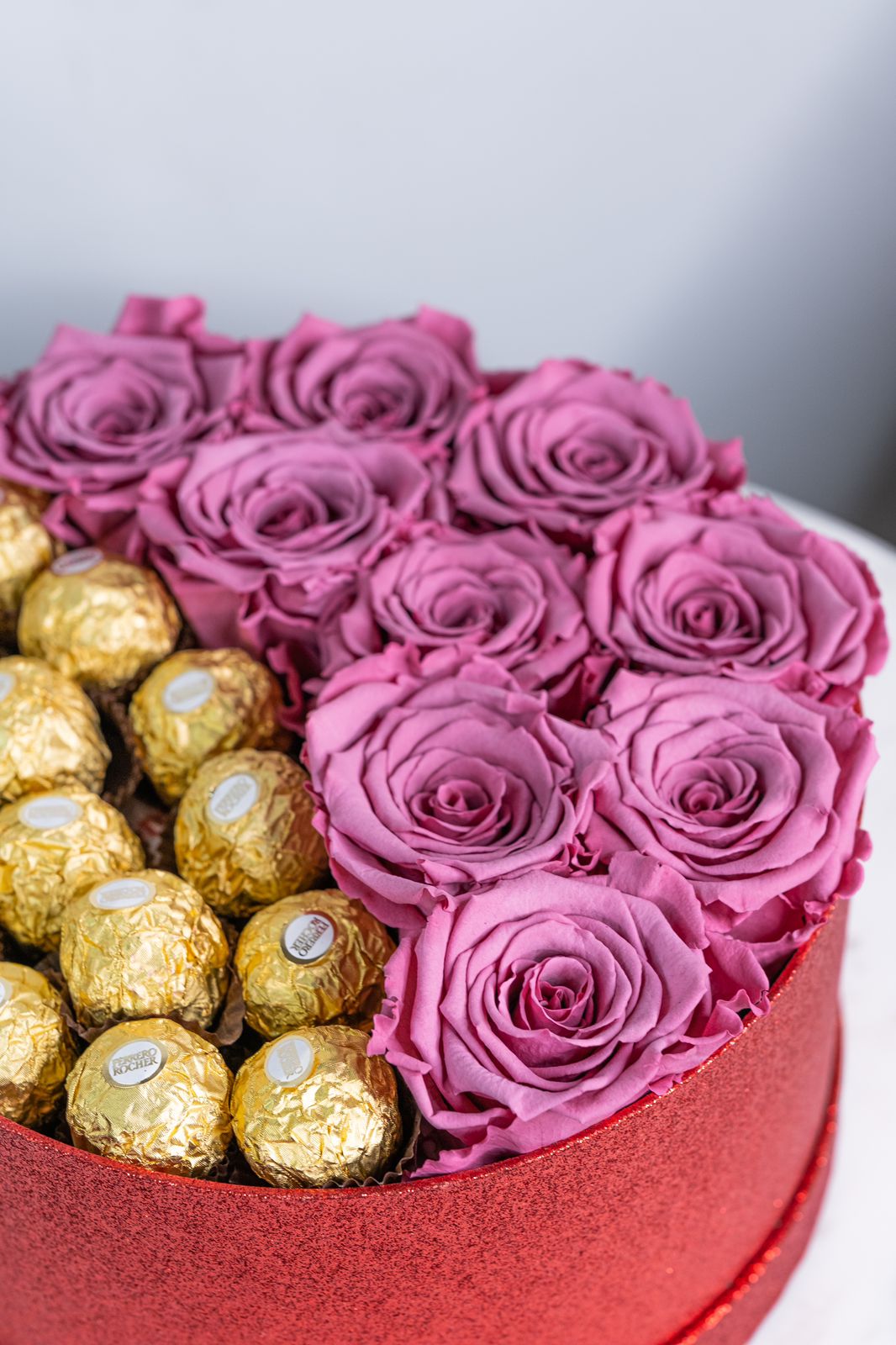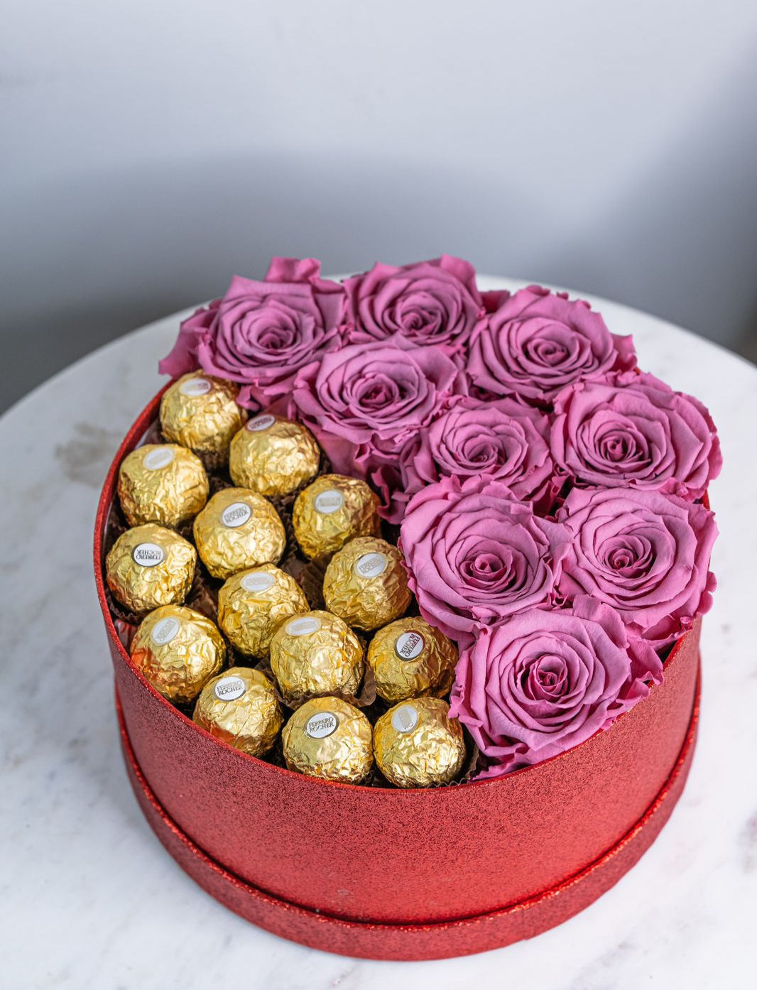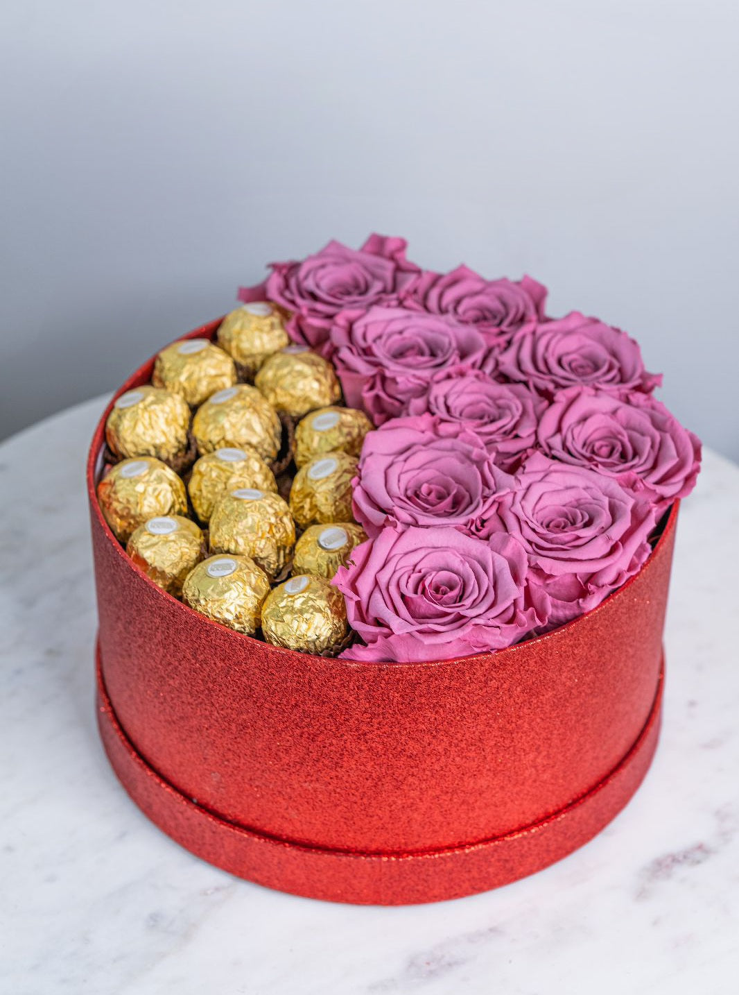 Everlastng roses and sweets in an elegant box. They will complement a romantic evening on Valentine's Day and turn any weekday into a holiday.