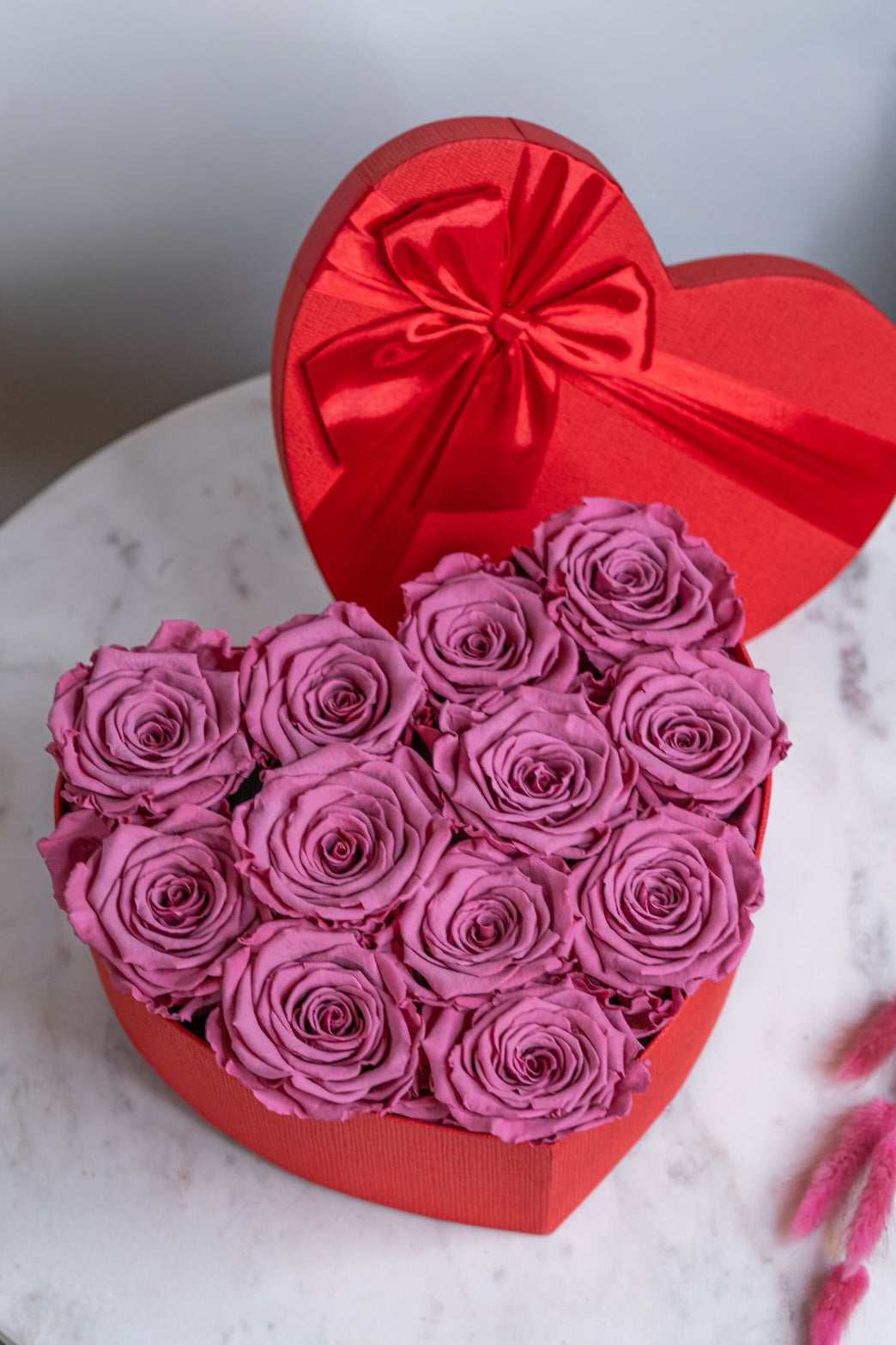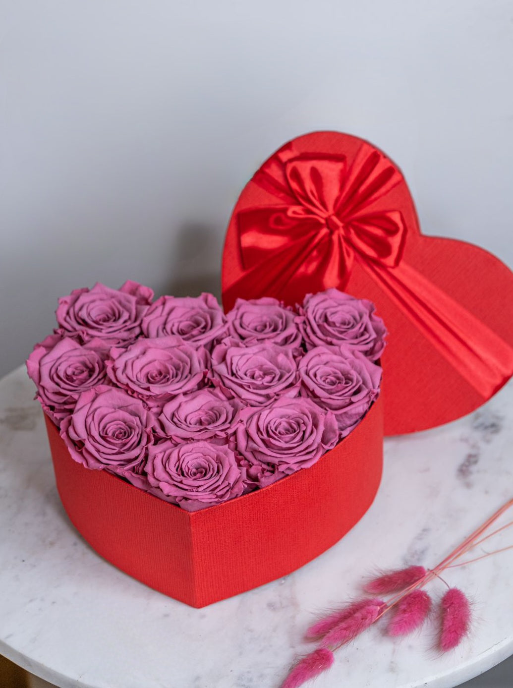 Everlasting Pink heart-shaped roses in an elegant box. They will complement a romantic evening on Valentine's Day and turn any weekday into a holiday
