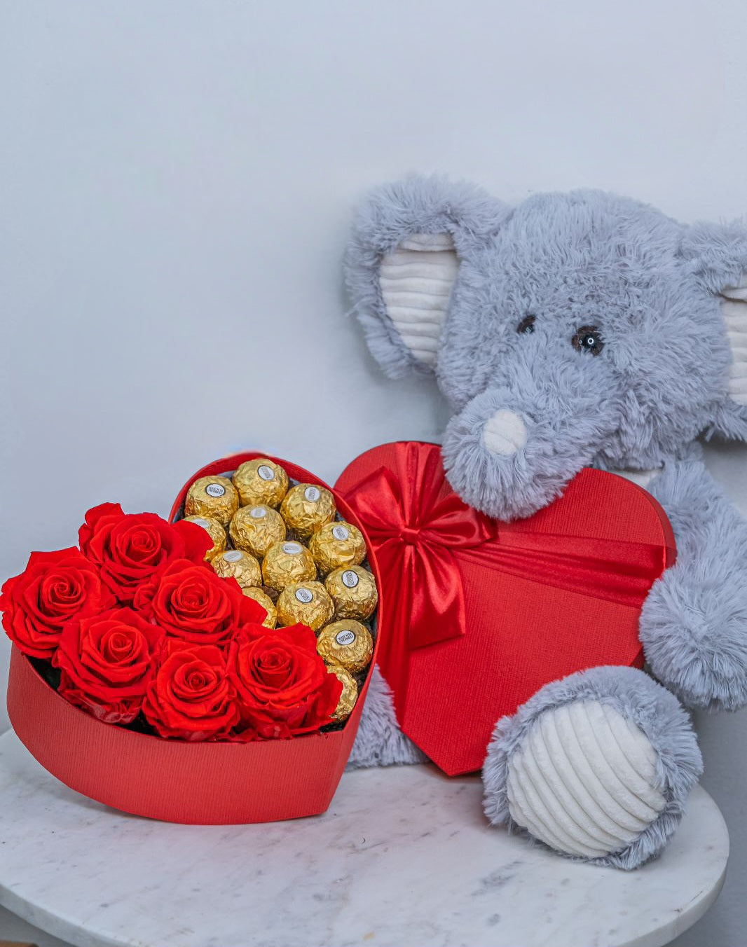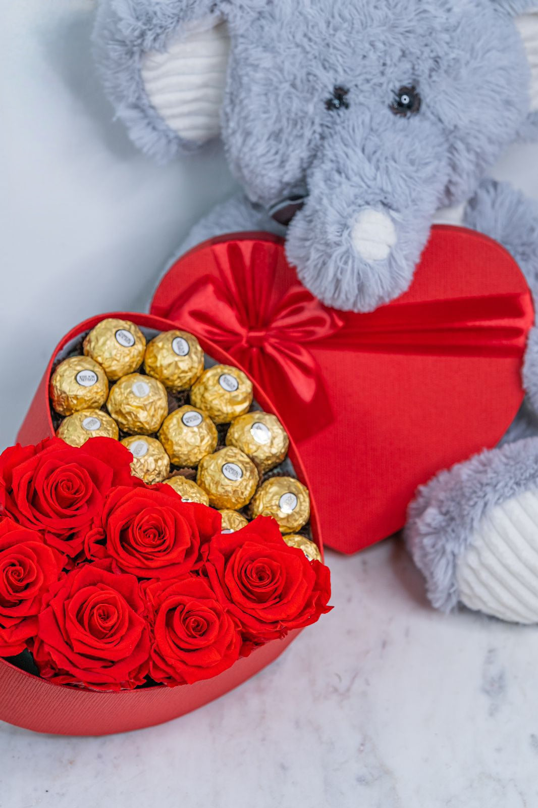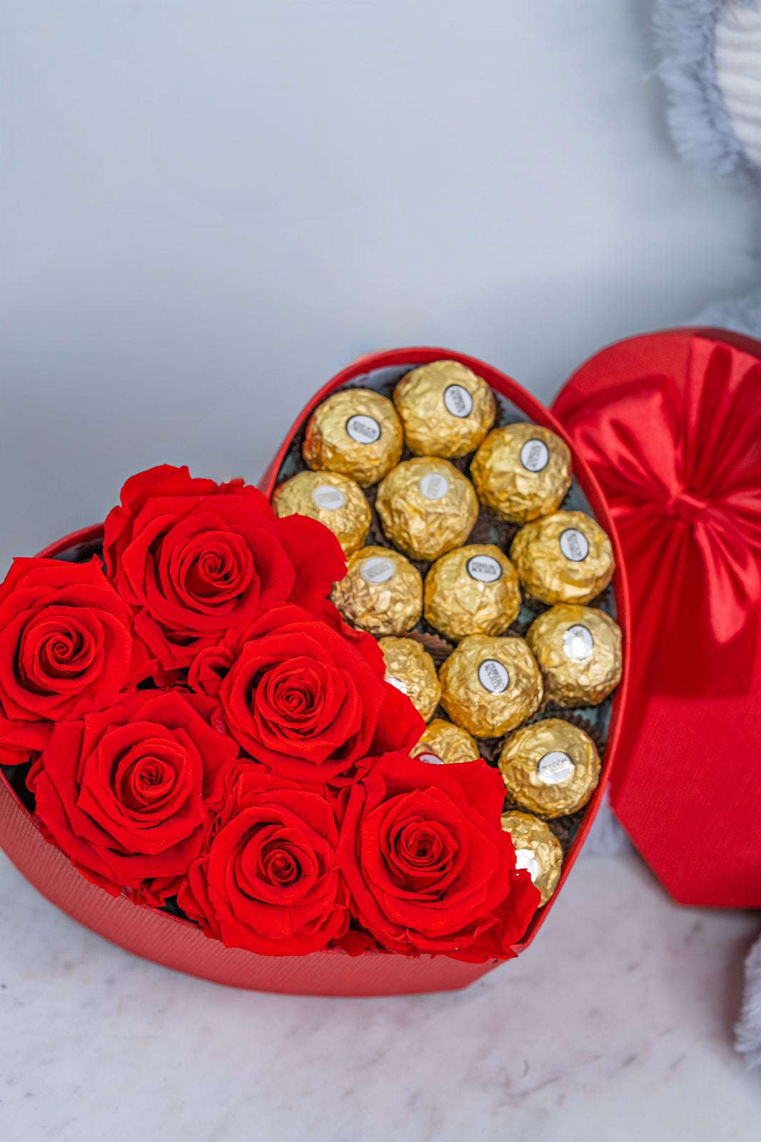 Everlastng roses and sweets in an elegant box. They will complement a romantic evening on Valentine's Day and turn any weekday into a holiday.