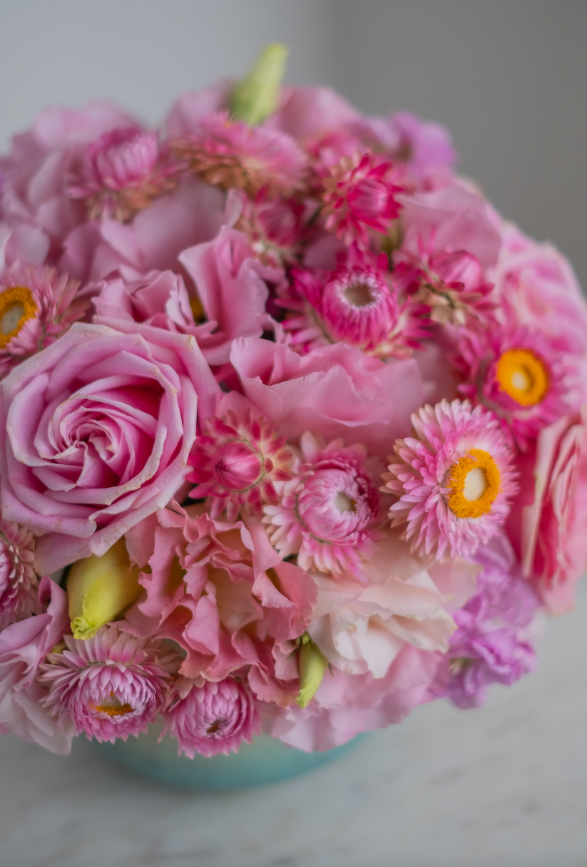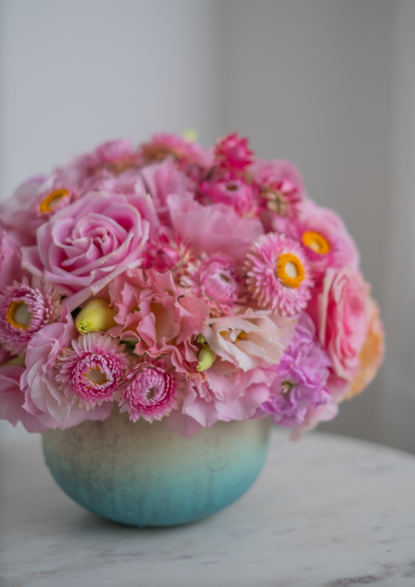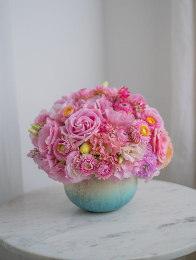 A delicate blue vase with bright pink shades of flowers. Like strawberry ice cream melting on a blue cloud sunset. Pink is the color of femininity, but its range of shades is very extensive, and each of them has its own mood. Specify your wishes when ordering, and the florist will put together a composition that is perfect for you.