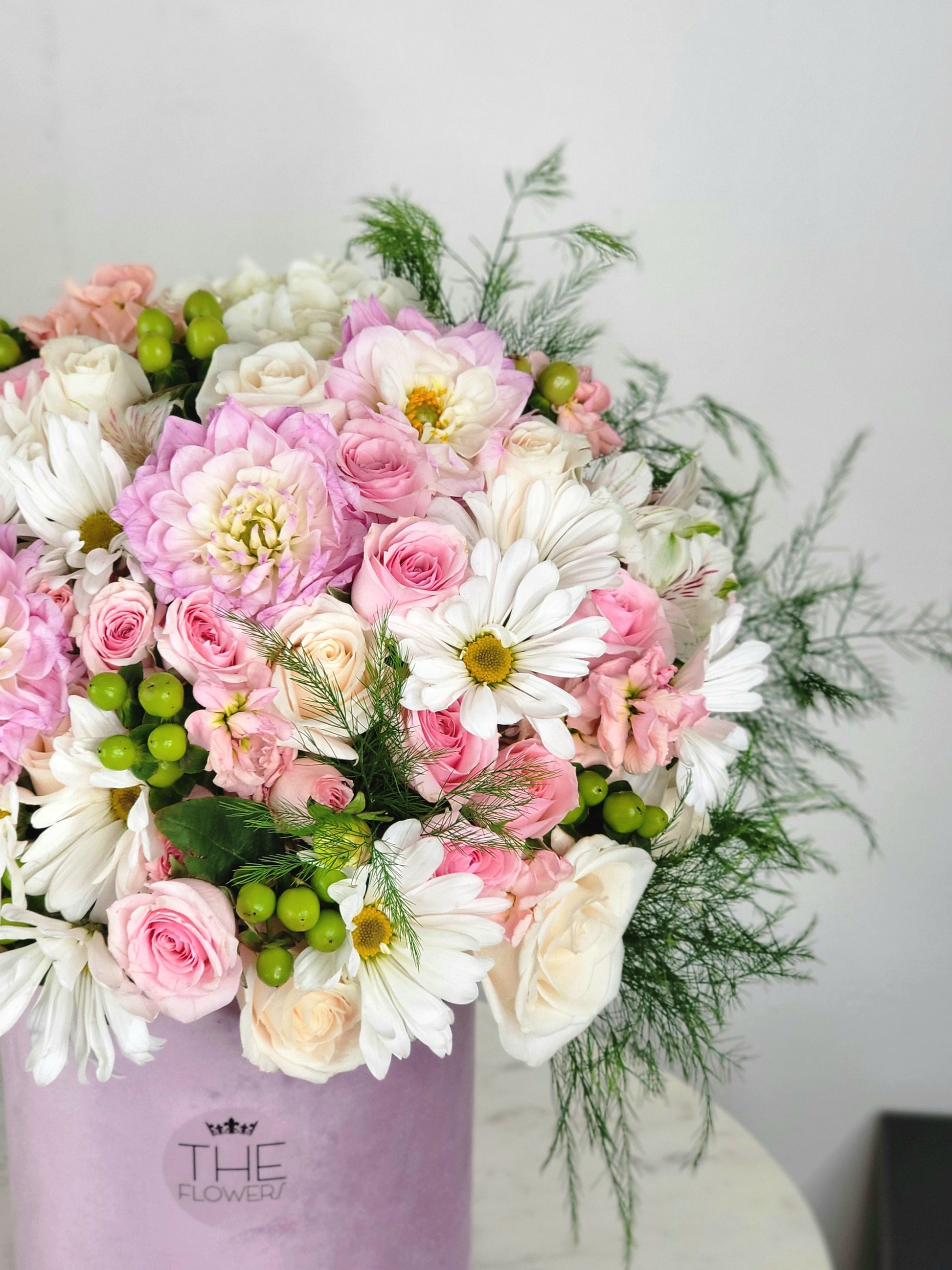A composition with pink dahlias, white roses. cute chrysanthemums look fresh and relevant in any season.