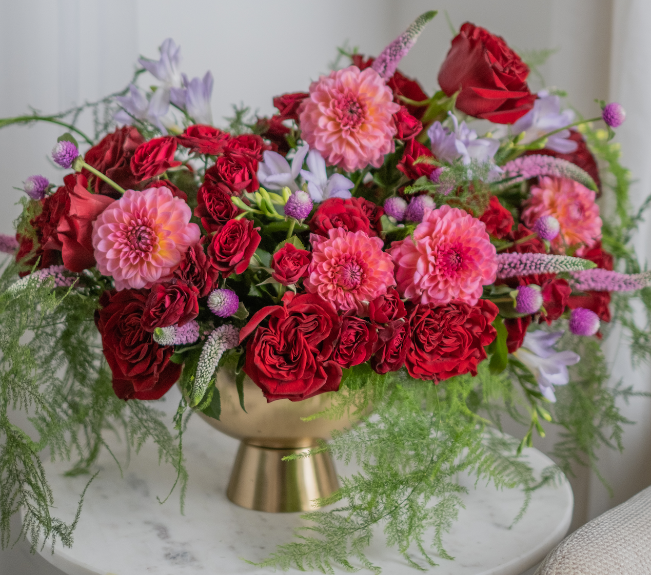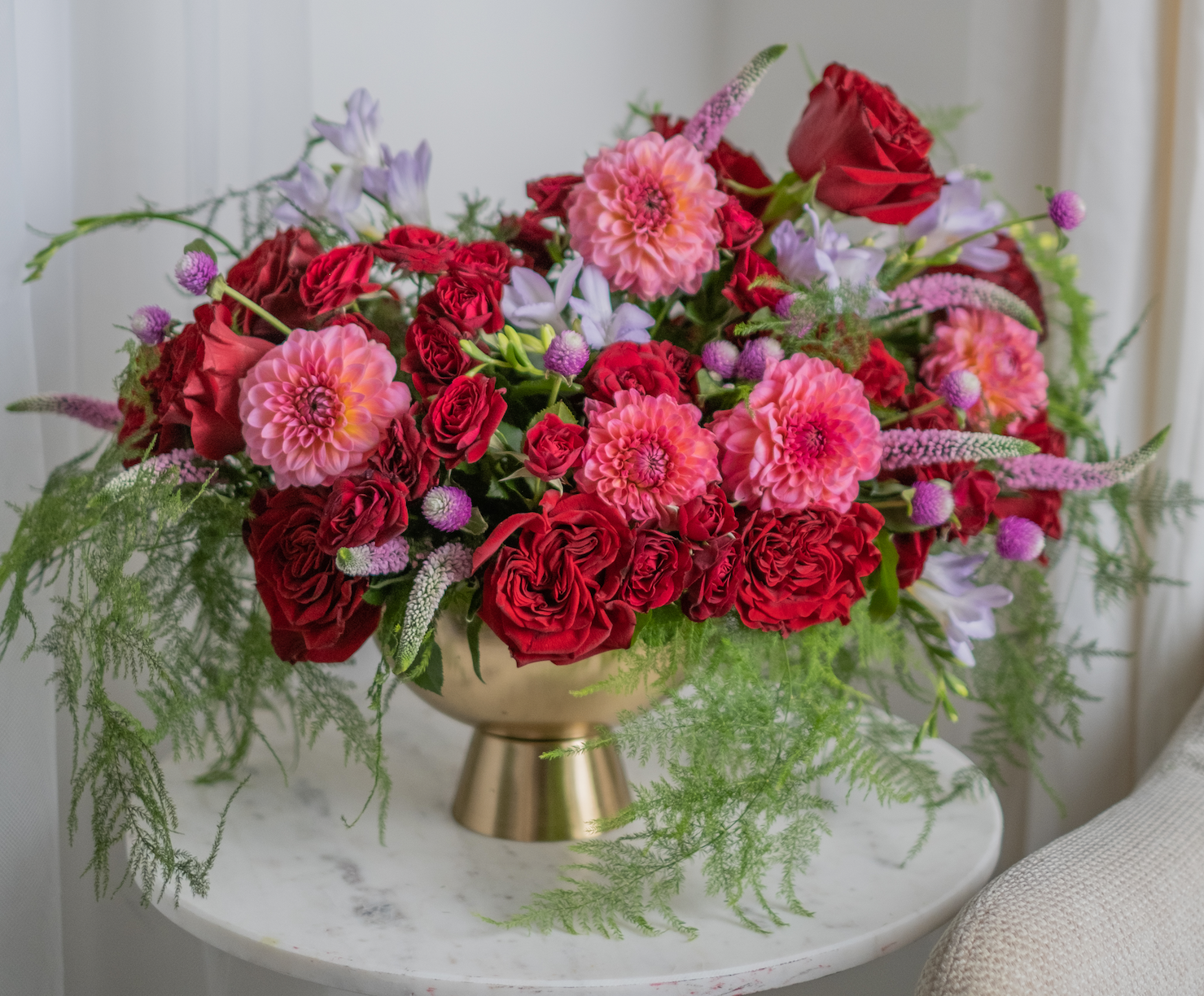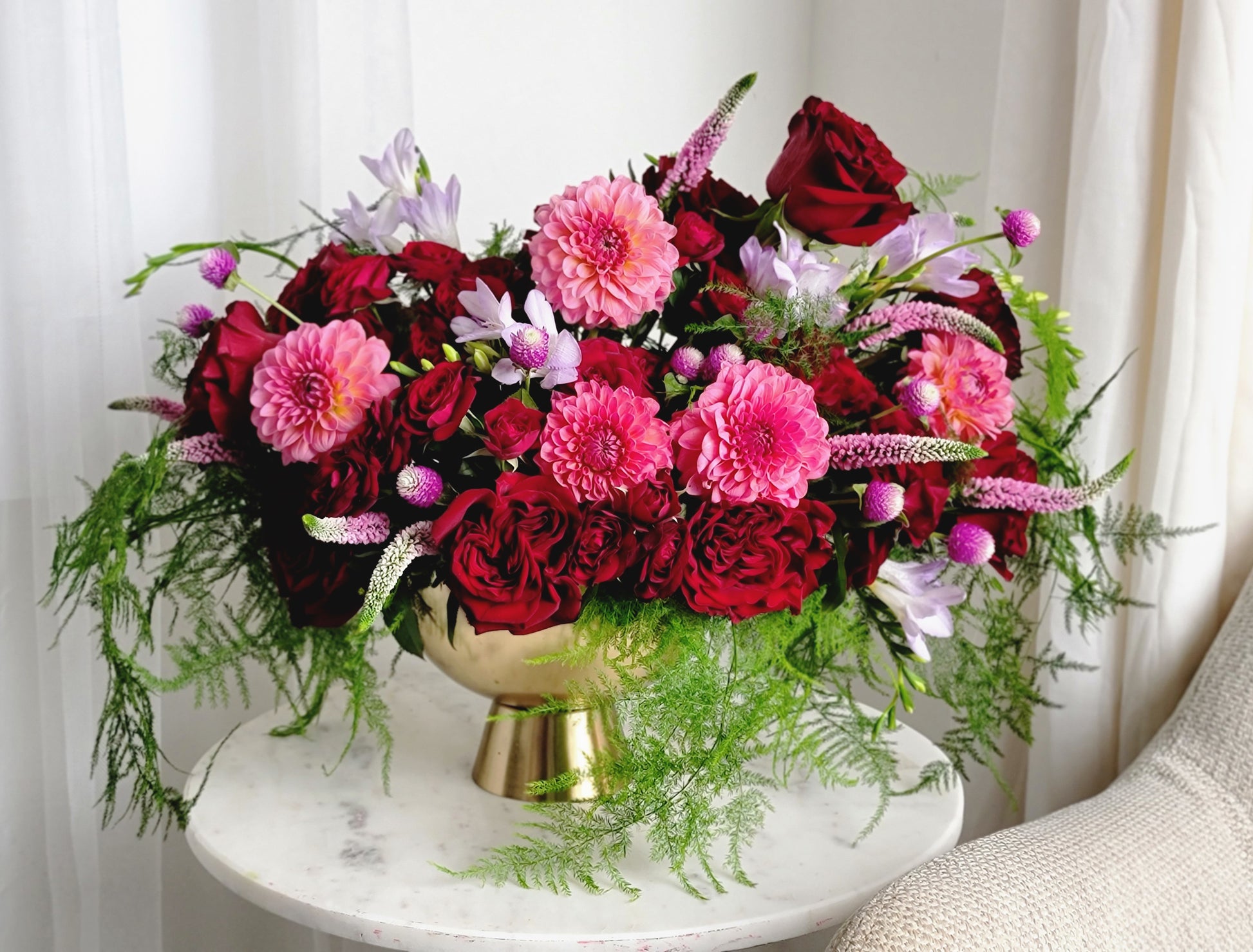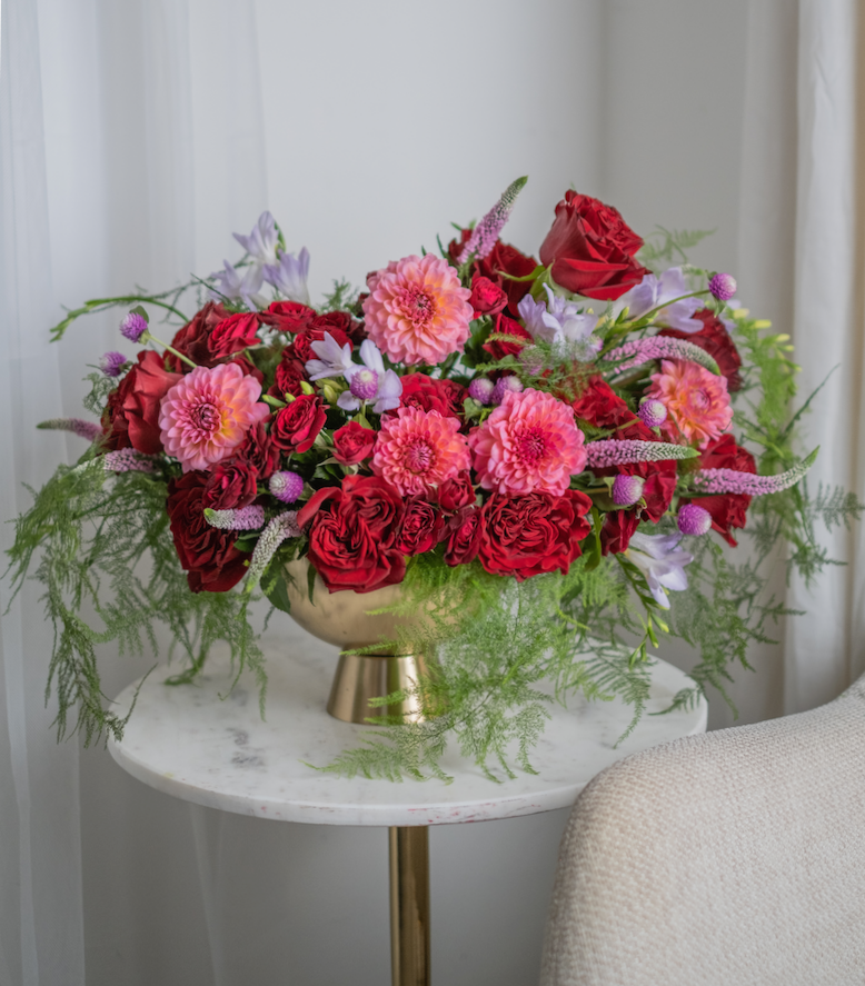 An arrangement in burgundy and saturated shades stands out for its depth of color. Such a composition is suitable not only for a woman, but also for a man. It is also appropriate to give it to a partner, as it has a special restraint, but it is also suitable as a gift for a loved one who loves deep shades.