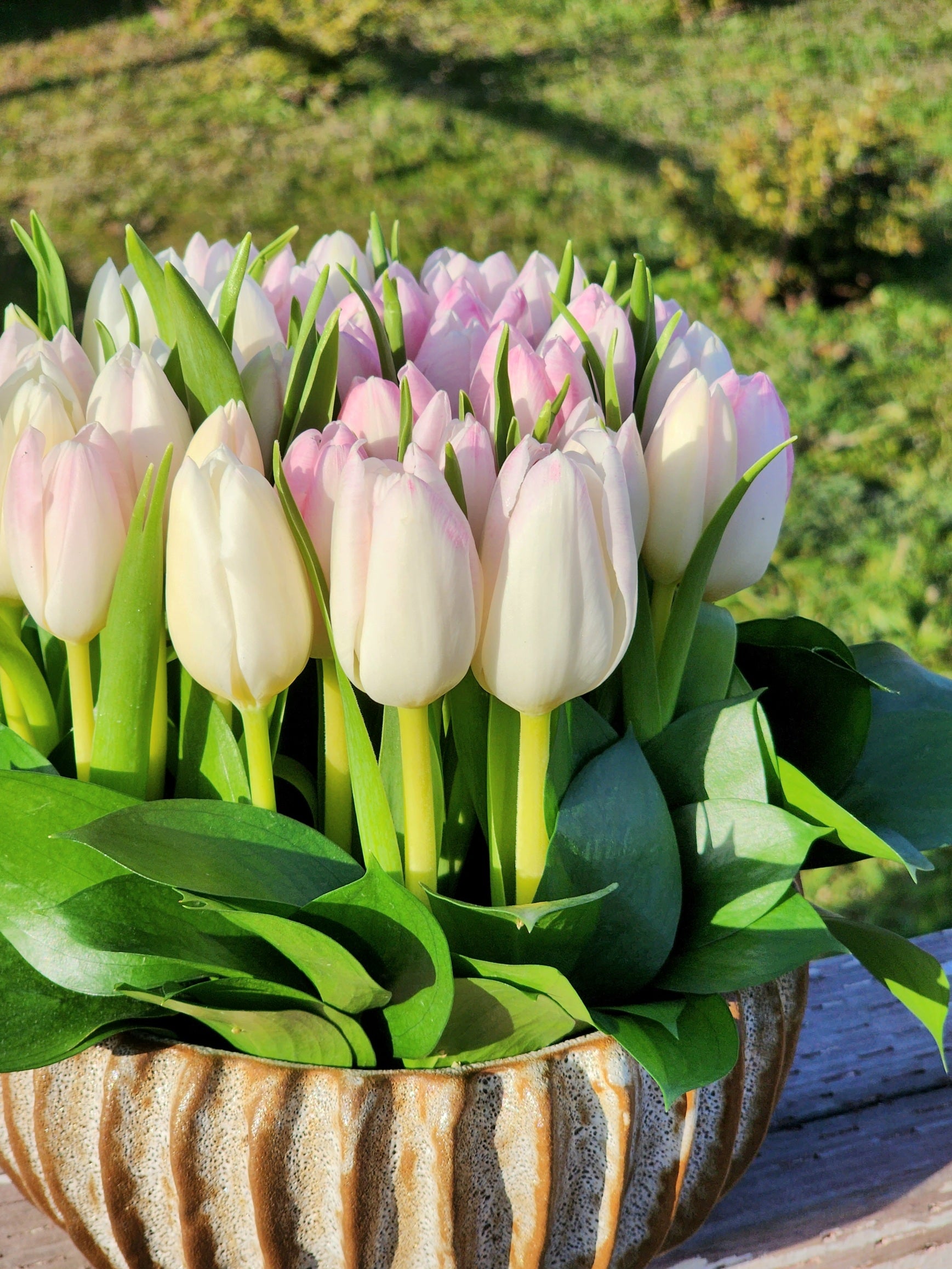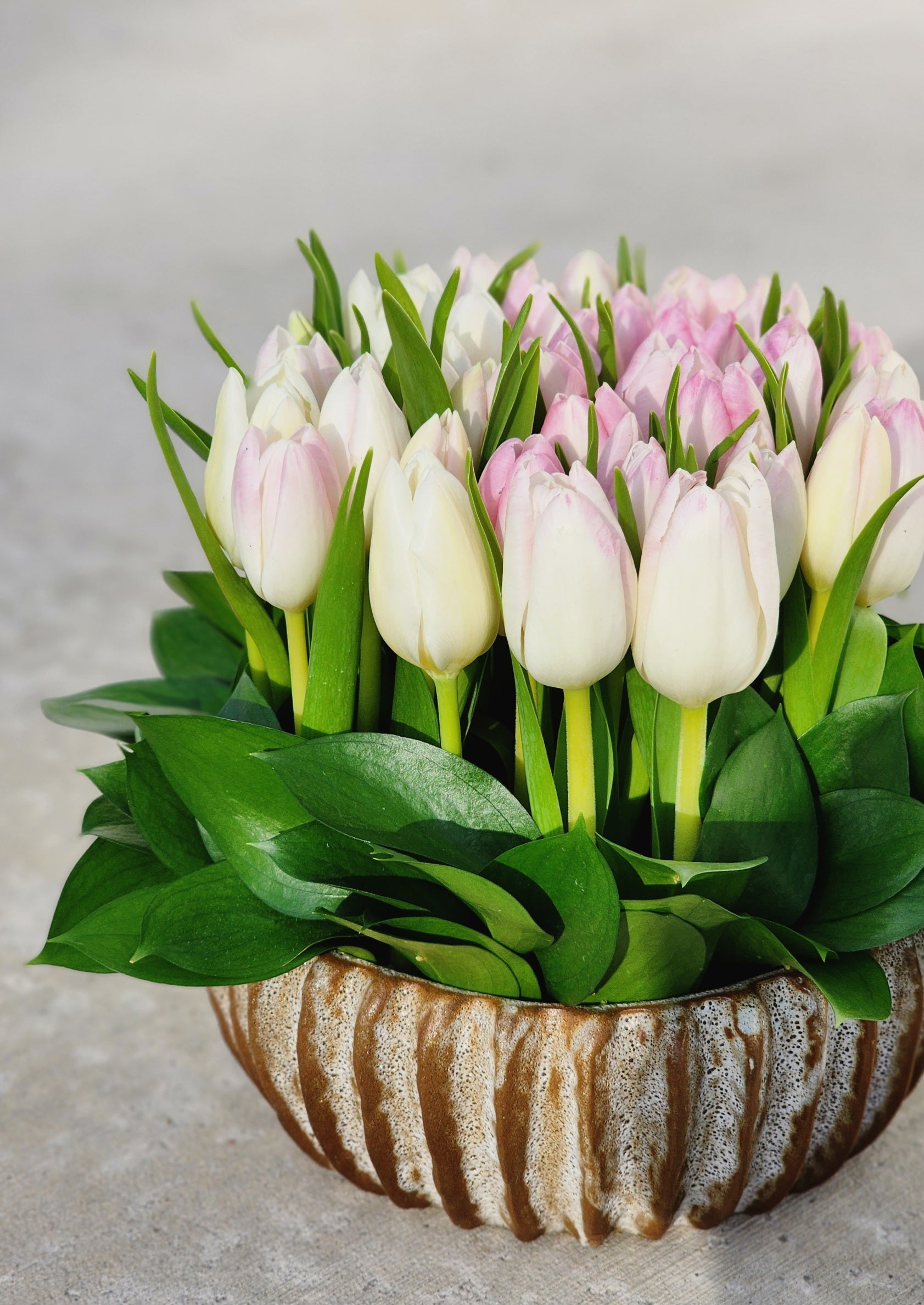 Tulips are one of the most romantic flowers, as they look very fragile and delicate. Pale pink tulips in a low vase look luxurious and festive. We assure you that everyone will be delighted with such a gift!