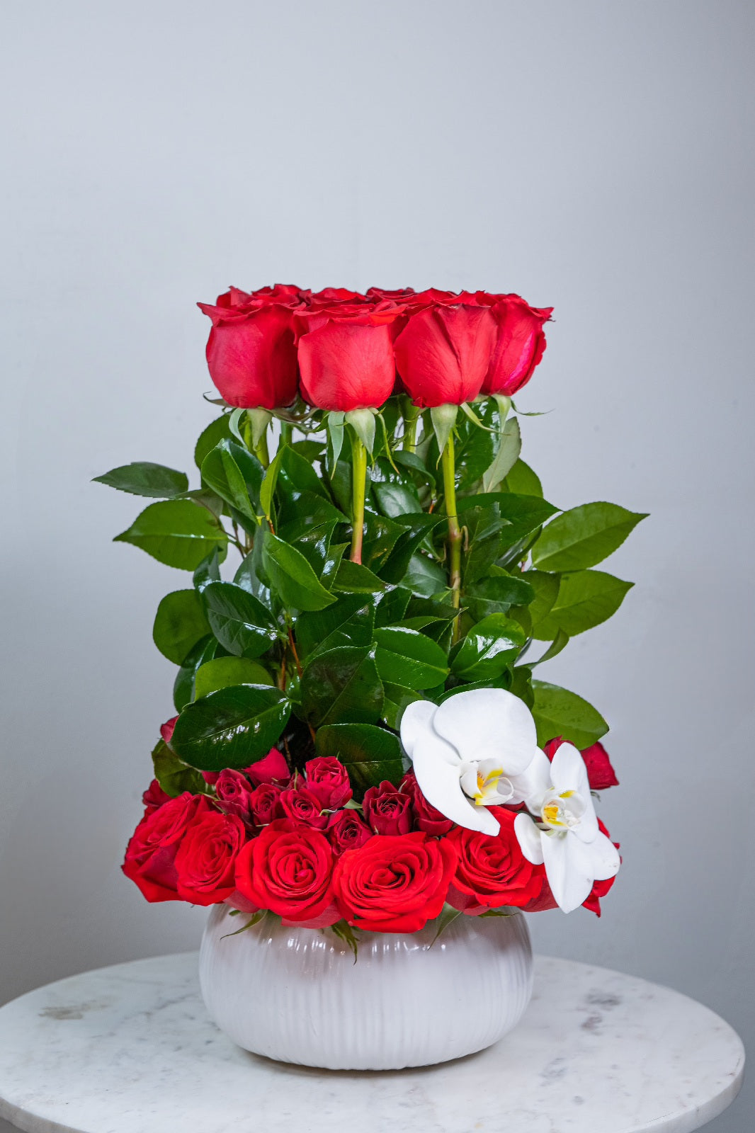Red roses are such a classic. In a white vase, they give a wow effect, look attractive and elegant. If you want to make a truly exciting gift, then we advise you to choose this amazingly beautiful composition