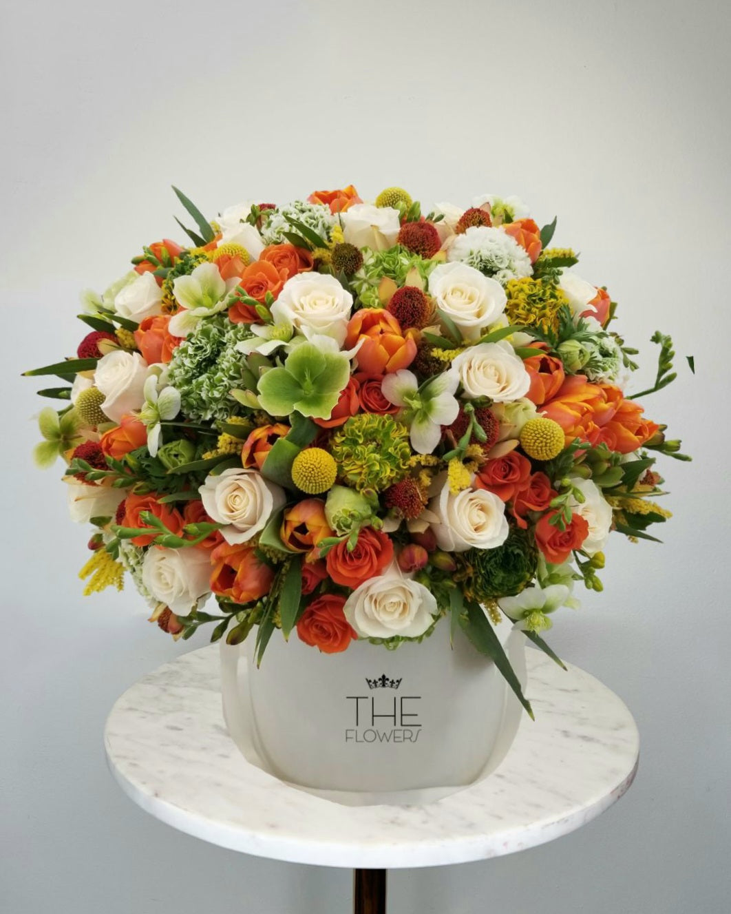 An amazingly bright and attractive composition in a box is sure to charge with energy and optimism! Orange tulips, white roses and a variety of greenery are associated with summer, sunny warmth, animation, joy.