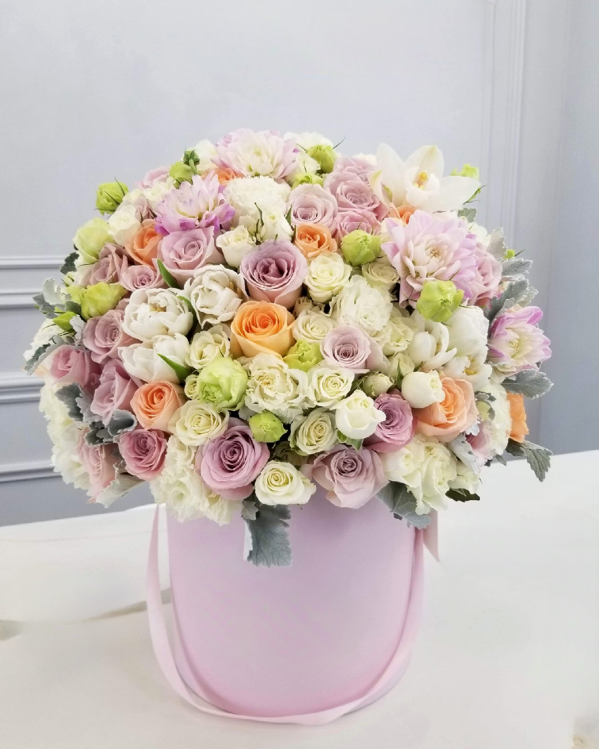Delicate and light arrangements in a box with peach, pink roses, tulips, and spray roses slightly touched with greenery symbolize the strongest, purest, and strongest feelings and best wishes