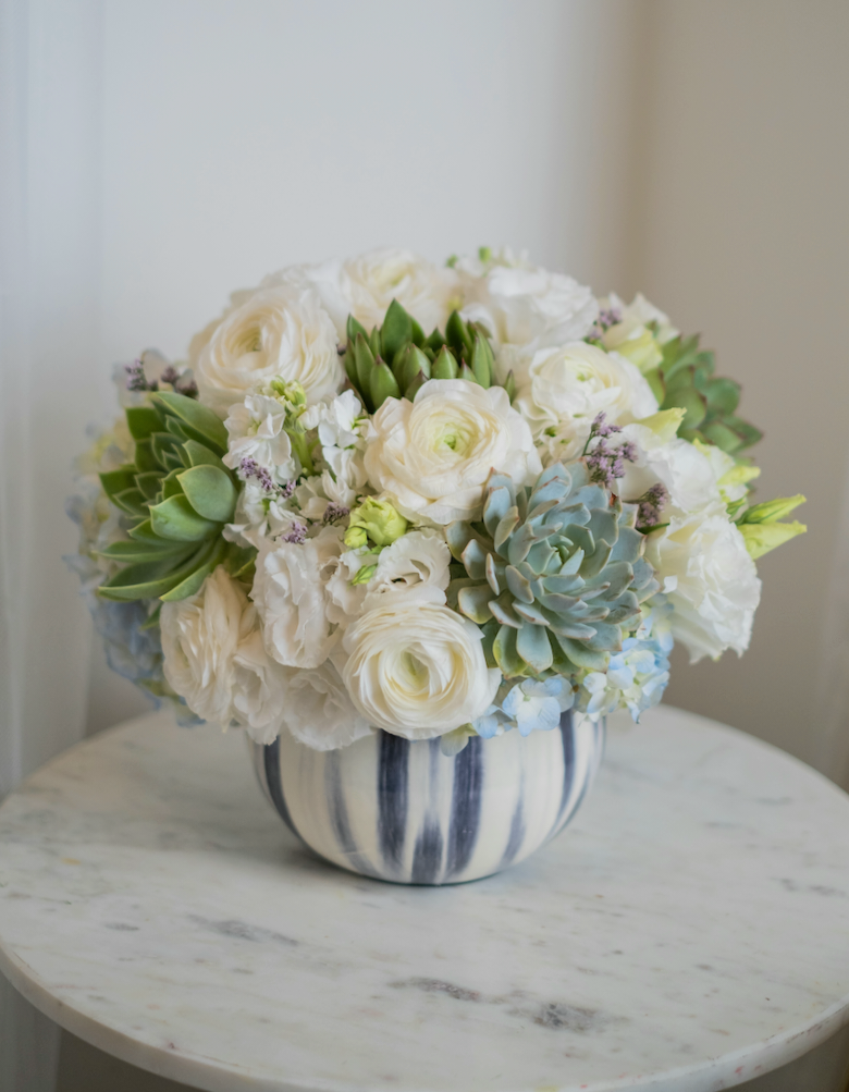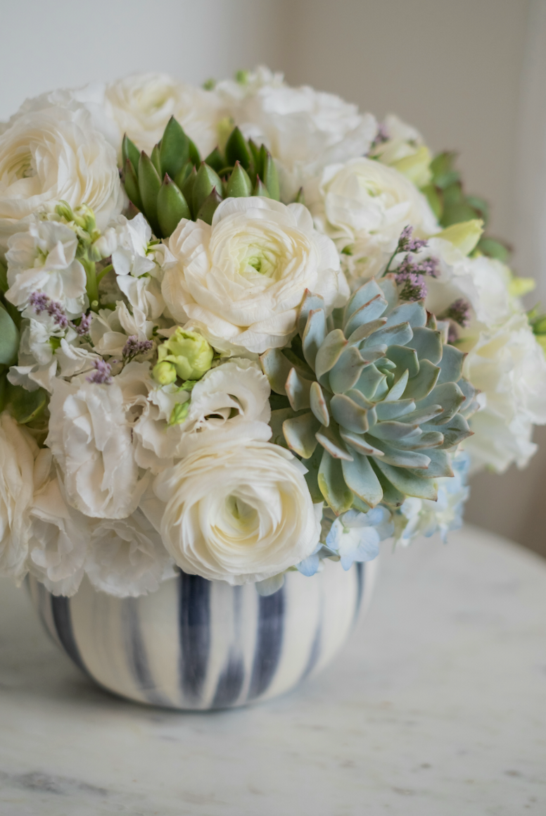 The arrangement with delicate white rununculuses and elegant succulents looks interesting and harmonious in a Portuguese vase.