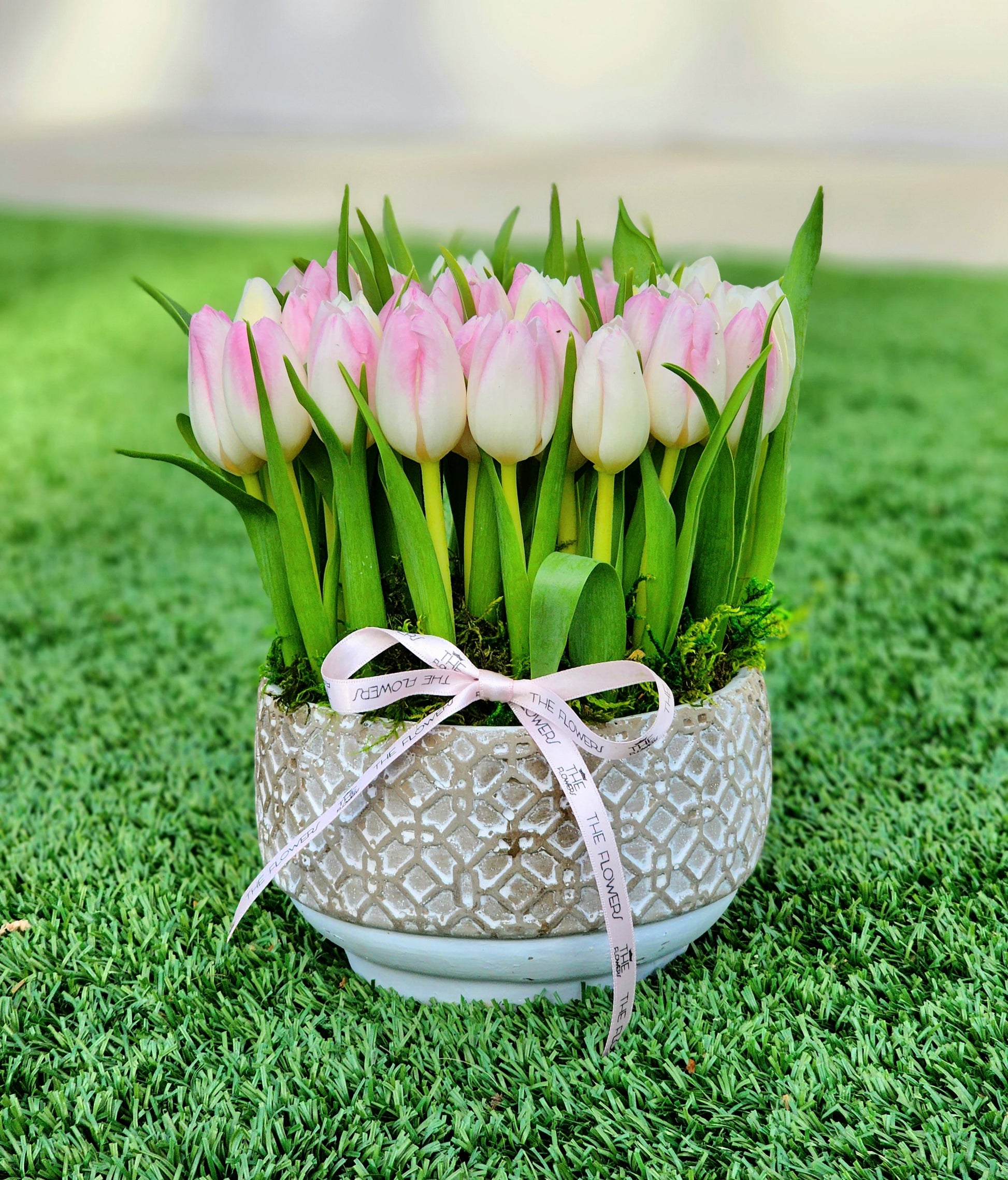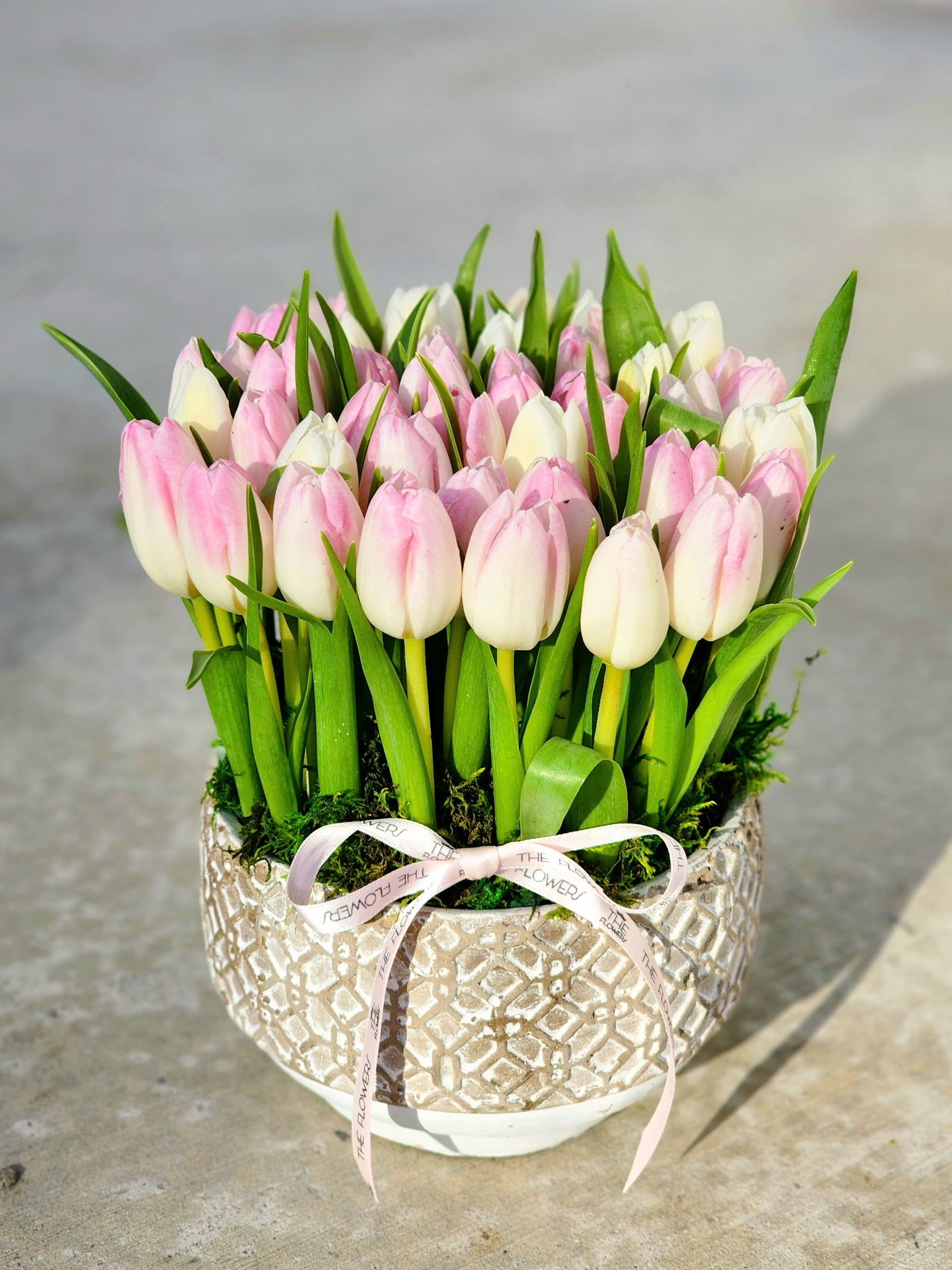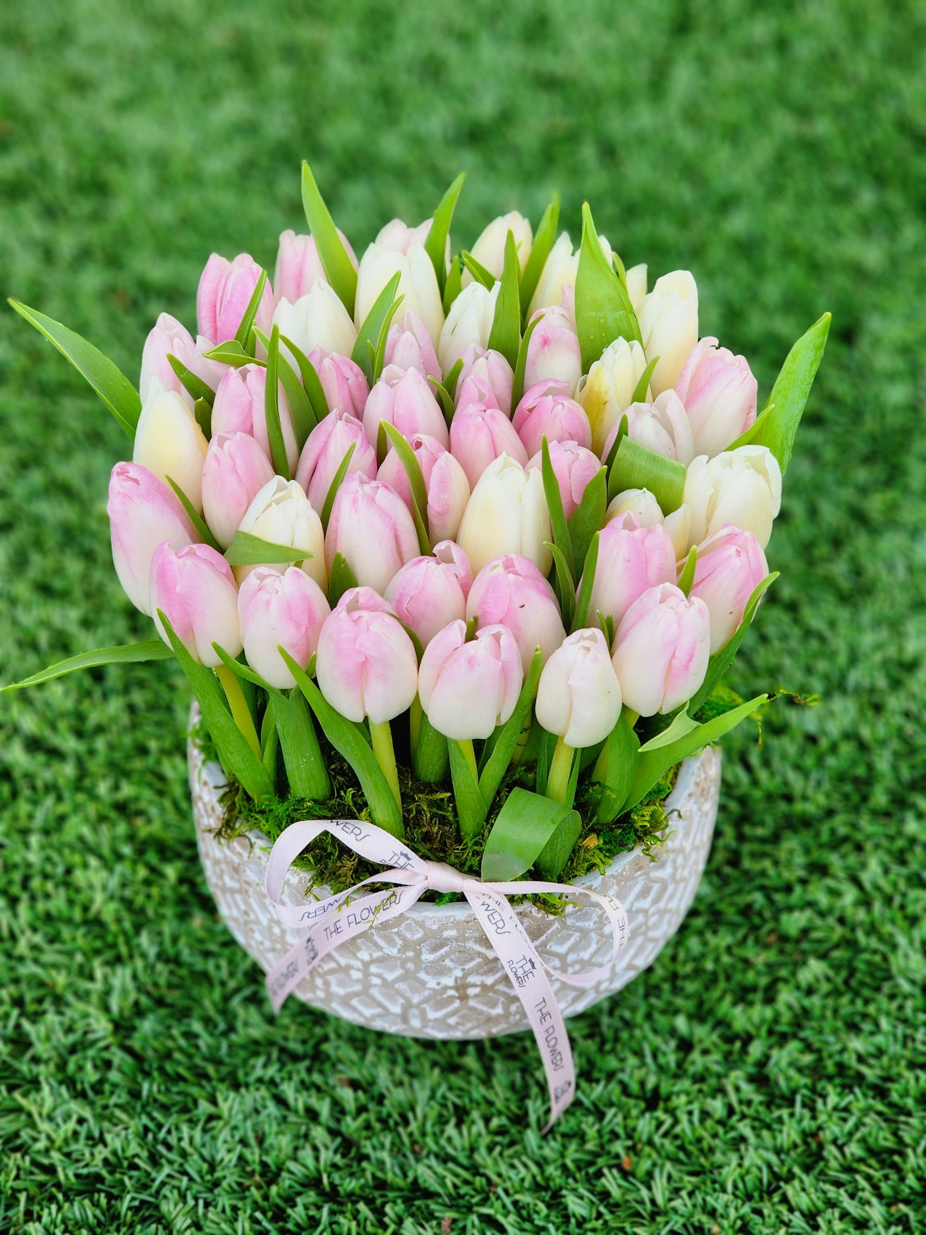 Tulips are one of the most romantic flowers, as they look very fragile and delicate. 50 Soft pink tulips in a low vase look luxurious and festive. We assure you that everyone will be delighted with such a gift!